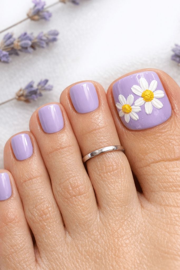 16. Lavender Daisy Accent Spring Toe Nail Color with Floral Elegance