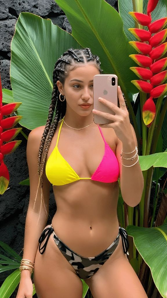 There’s something unapologetically fun about a hot-pink-and-yellow bikini—it’s bright, punchy, and instantly vacation-coded. The tropical greenery makes the colors feel even more electric, like the whole scene is glowing. It’s playful, confident, and perfect for that “main character energy” summer moment.