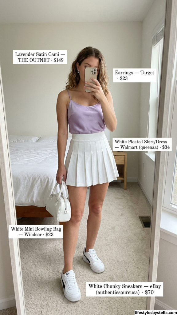 Shop This Look: The Lavender Satin Cami is from THE OUTNET at $149 — shop it here. The Earrings are from Target at $23 — find them here. The White Pleated Skirt/Dress by Queenaa is available at Walmart for $34 — grab it here. The White Mini Bowling Bag from Windsor at $23 — snag it here. And the White Chunky Sneakers from eBay (authenticsourceusa) at $70 — check them out here.
