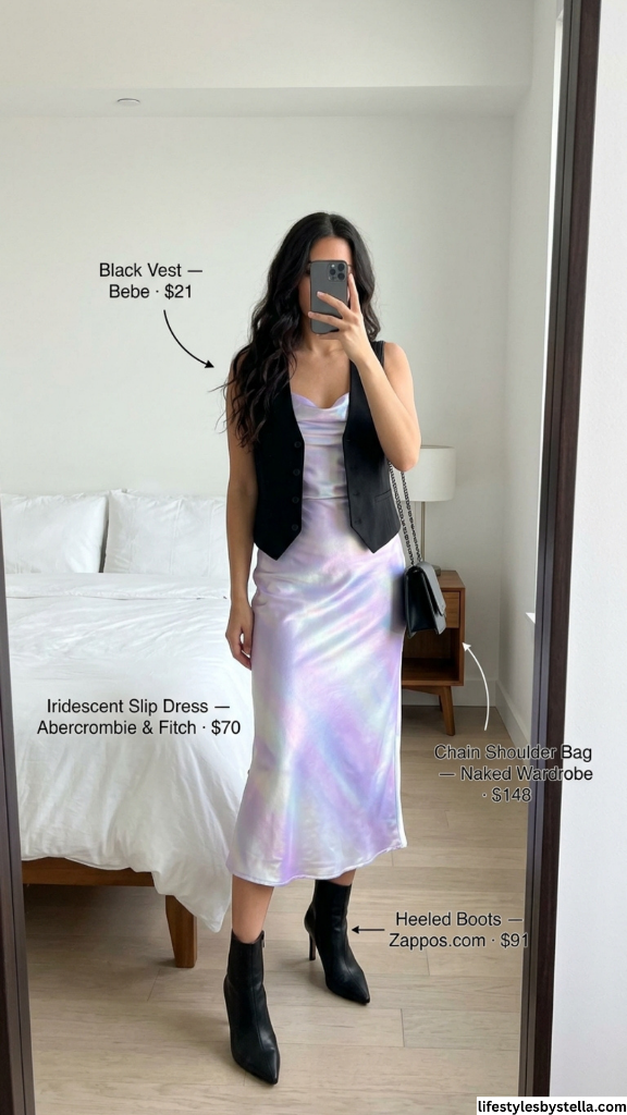 I love when an outfit makes you do a double take — and this iridescent slip dress layered under a black vest is exactly that. The slip dress has this dreamy, almost holographic quality, shifting between lavender and pearl depending on the light. It’s the kind of fabric that feels like wearing a sunset. Then you throw a structured black vest over it, and suddenly the whole mood sharpens. It goes from ethereal to editorial in one layer.