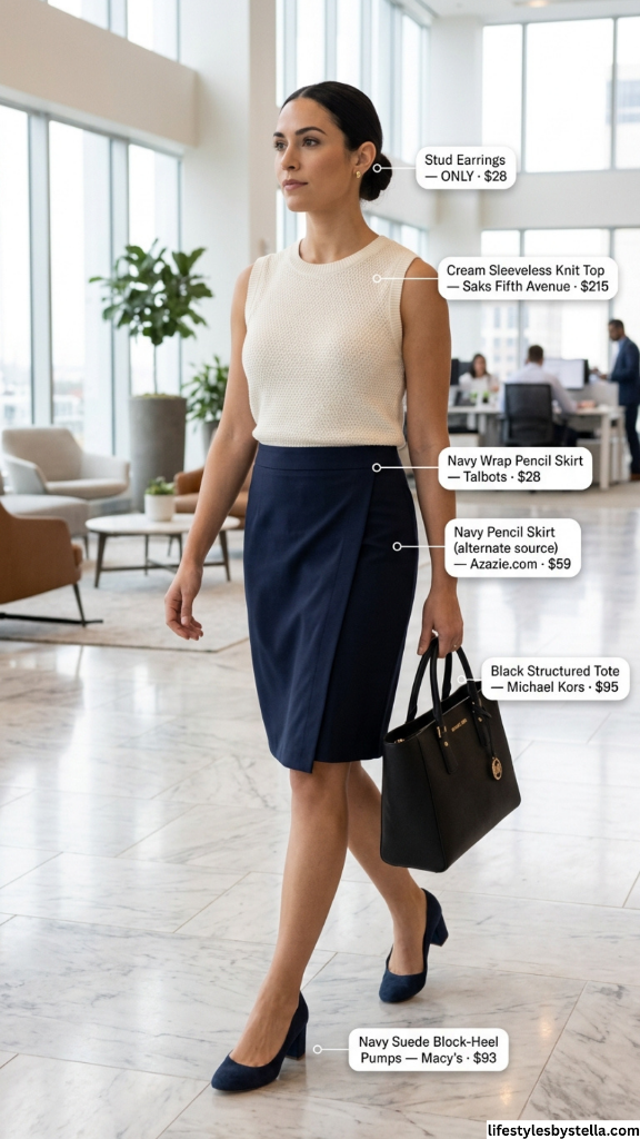 Shop This Look: The Cream Sleeveless Knit Top is from Saks Fifth Avenue at $215 — shop it here. The Stud Earrings are from ONLY at $28 — find them here. The Navy Wrap Pencil Skirt is from Talbots at $28 — grab it here. An alternate Navy Pencil Skirt option is available at Azazie.com for $59 — check it out here. The Black Structured Tote by Michael Kors at $95 — snag it here. And the Navy Suede Block-Heel Pumps from Macy’s at $93 — shop them here.