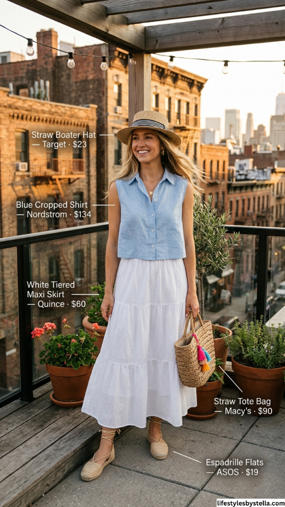 Shop This Look: The Straw Boater Hat is from Target at $23 — shop it here. The Blue Cropped Shirt is from Nordstrom at $134 — find it here. The White Tiered Maxi Skirt from Quince at $60 — grab it here. The Straw Tote Bag is from Macy’s at $90 — check it out here. And the Espadrille Flats from ASOS at $19 — snag them here.