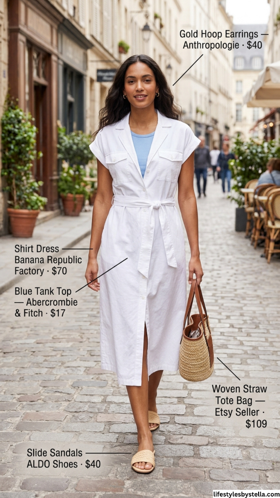 The gold hoop earrings add a simple but effective touch of warmth, and the woven straw tote bag grounds the look with that artisanal feel that’s been dominating summer accessories. The slide sandals keep things practical — because cobblestones and heels are a relationship that never works. What I love most is the layering trick: wearing a colored tank underneath a white dress or top instantly adds dimension and prevents any sheerness issues. It’s a small styling detail that makes a big difference.