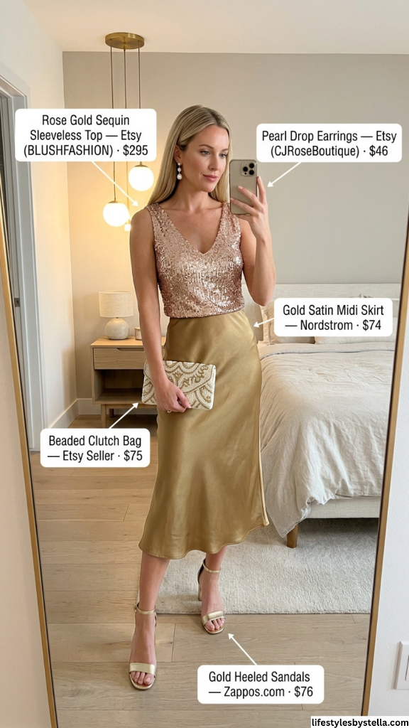 Shop This Look: The Rose Gold Sequin Sleeveless Top is from Etsy (BLUSHFASHION) at $295 — shop it here. The Pearl Drop Earrings from Etsy (CJRoseBoutique) at $46 — find them here. The Gold Satin Midi Skirt is from Nordstrom at $74 — grab it here. The Beaded Clutch Bag from an Etsy Seller at $75 — check it out here. And the Gold Heeled Sandals from Zappos.com at $76 — snag them here.