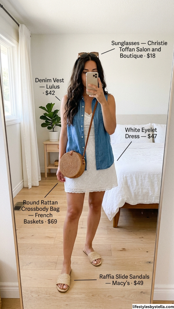 Shop This Look: The Sunglasses are from Christie Toffan Salon and Boutique at $18 — shop them here. The Denim Vest from Lulus at $42 — find it here. The White Eyelet Dress at $47 — grab it here. The Round Rattan Crossbody Bag from French Baskets at $69 — check it out here. And the Raffia Slide Sandals from Macy’s at $49 — snag them here.