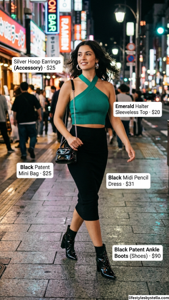 If there’s one color that makes a statement without screaming, it’s emerald green — and this halter sleeveless crop top wears it like a crown. The cross-front halter neckline is architectural and eye-catching, framing the shoulders and collarbone in the most flattering way possible. Against the backdrop of neon city lights and a bustling street, this top practically glows. Paired with a black midi pencil dress worn as a skirt, the silhouette is sleek, elongated, and undeniably confident.