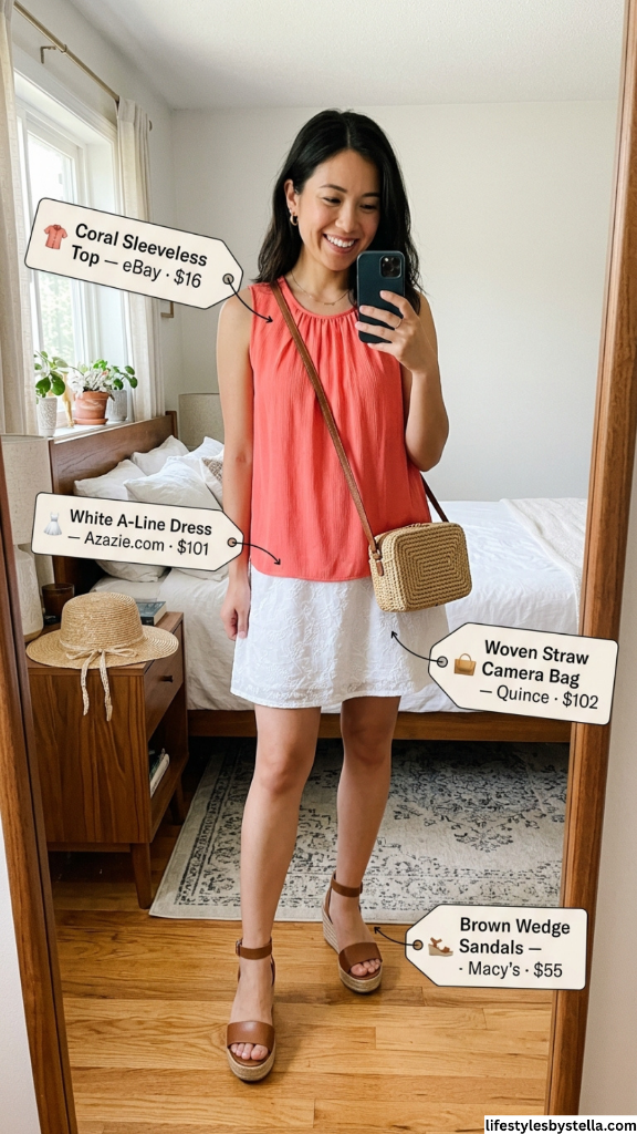 Shop This Look: The Coral Sleeveless Top is from eBay at $16 — shop it here. The White A-Line Dress from Azazie.com at $101 — find it here. The Woven Straw Camera Bag from Quince at $102 — grab it here. And the Brown Wedge Sandals from Macy’s at $55 — snag them here.