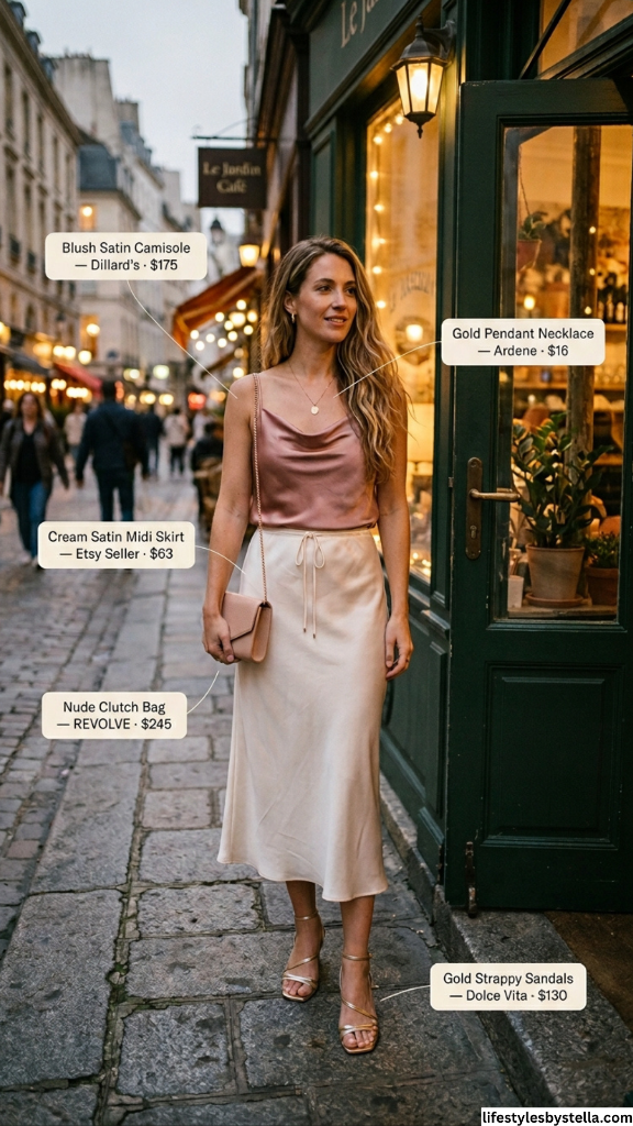 This. This is the outfit that stops people mid-stride on a cobblestone street. A blush satin camisole — that dusty rose shade that looks like it was invented for golden hour — paired with a cream satin midi skirt that moves like liquid. The tonal pairing of blush and cream creates a monochromatic effect that’s incredibly elegant without a single bold color in sight. It’s soft, it’s romantic, and it’s the kind of dressy sleeveless top outfit that makes a Parisian evening feel cinematic.