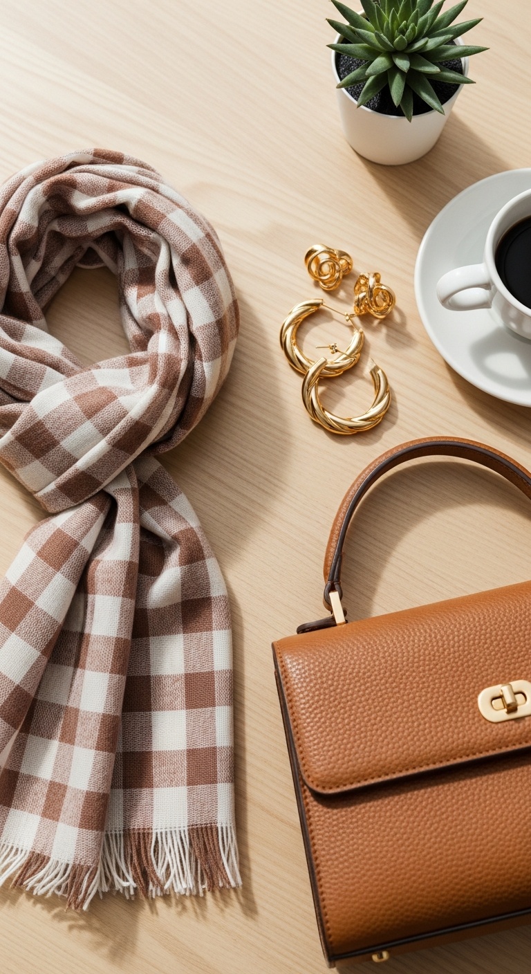 Alt text suggestion: Spring accessory flat-lay — muted check scarf, gold hoop earrings, and structured tan handbag on light wood surface