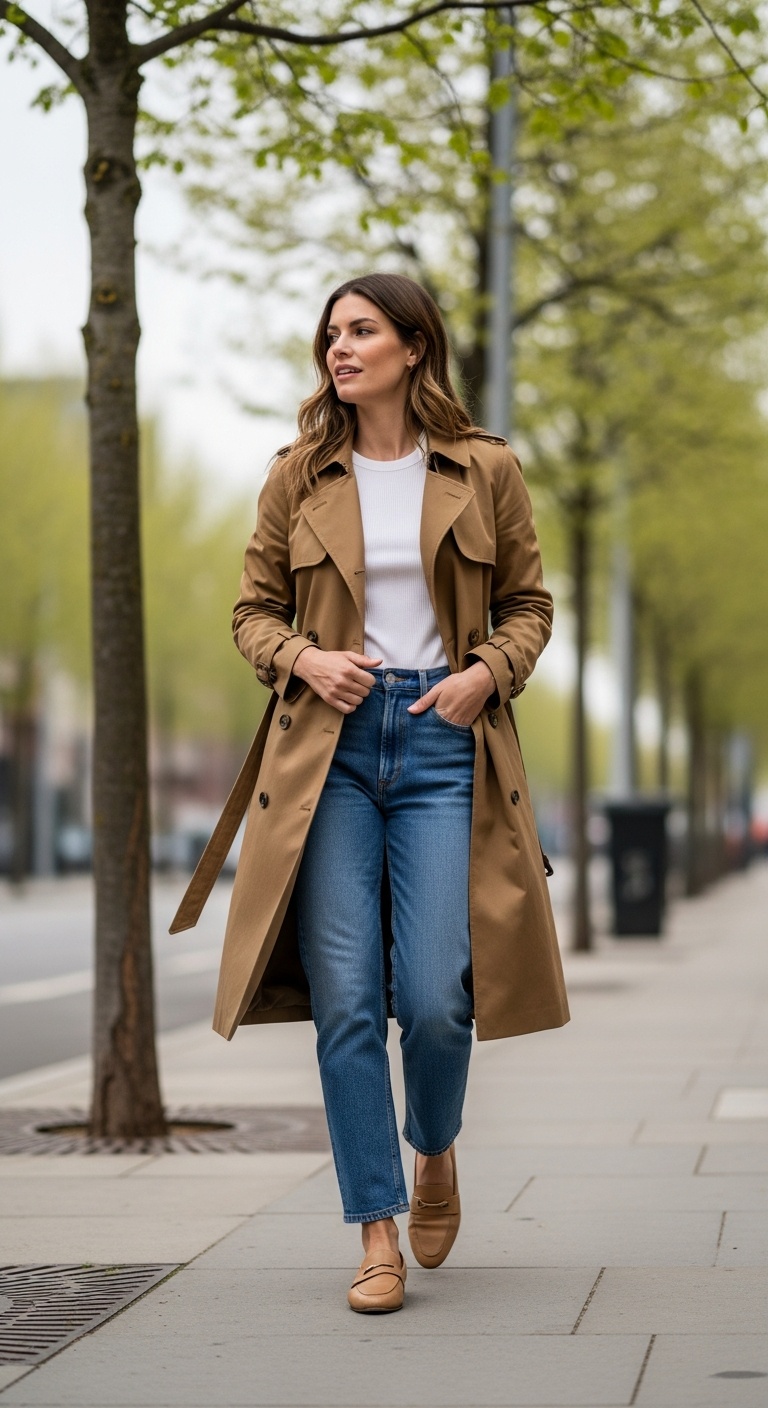 My current go-to is a mid-length cotton trench in a warm khaki — not too stiff, not too oversized. I belt it loosely over a fitted ribbed top and straight-leg jeans, then add loafers or low-heeled ankle boots depending on the day.