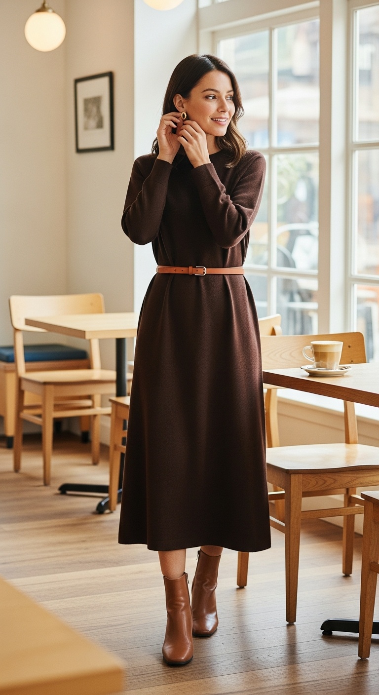 Alt text suggestion: Woman in chocolate brown knit midi dress with cognac belt and ankle boots — early spring outfit in café setting