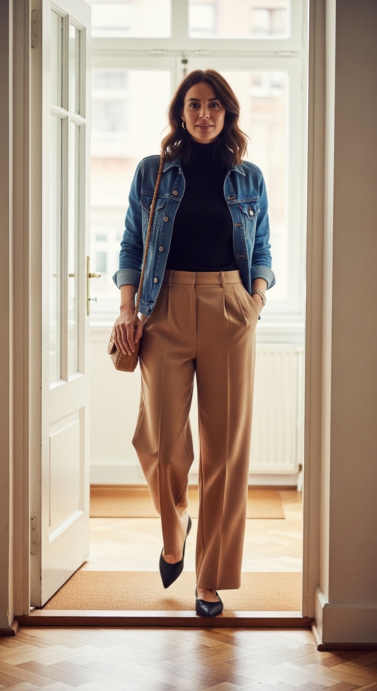 - A fitted turtleneck + relaxed wide-leg trousers + denim jacket