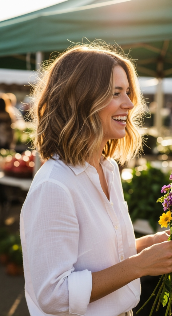 Alt text suggestion: Woman with effortless air-dried waves laughing at a spring farmer’s market — easy spring hairstyles 2026