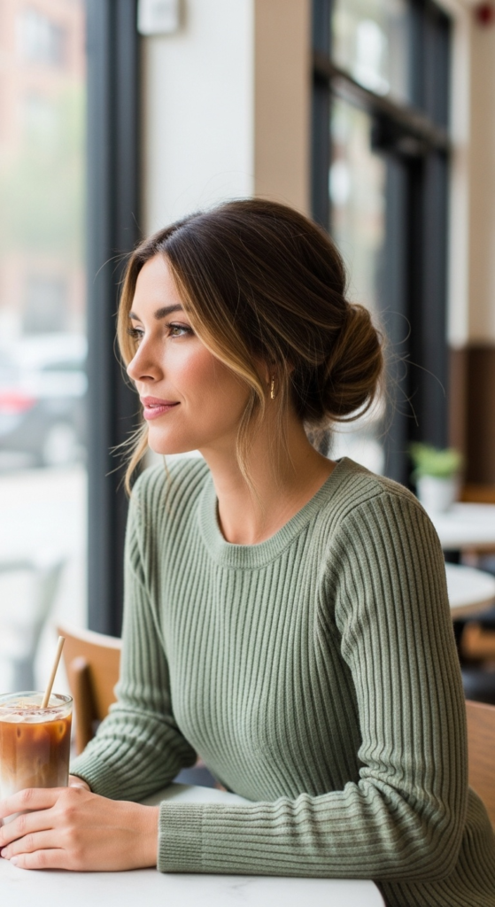 Alt text suggestion: Soft off-center low bun with face-framing tendrils at a spring café — spring hair ideas 2026