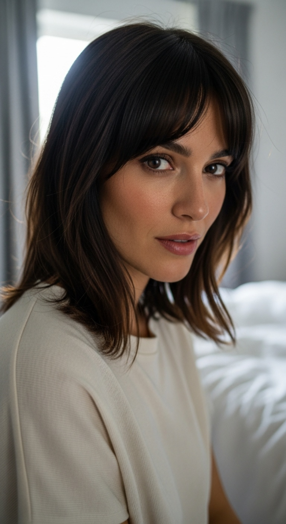 Alt text suggestion: Perfectly styled curtain bangs with warm undertones in soft morning light — curtain bangs spring 2026