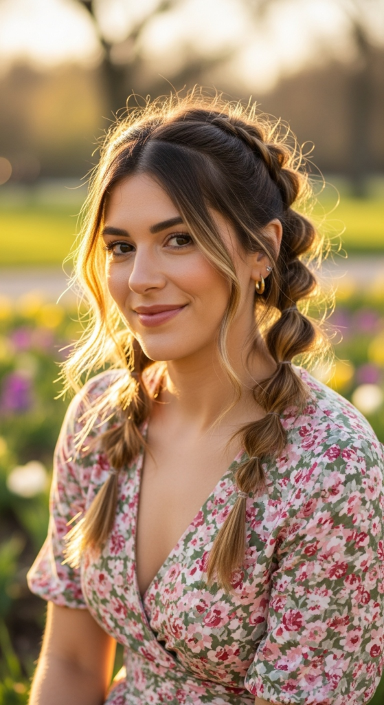 Alt text suggestion: Loose imperfect two-strand spring braids with golden highlights in a blooming garden — effortless spring braided hairstyles 2026