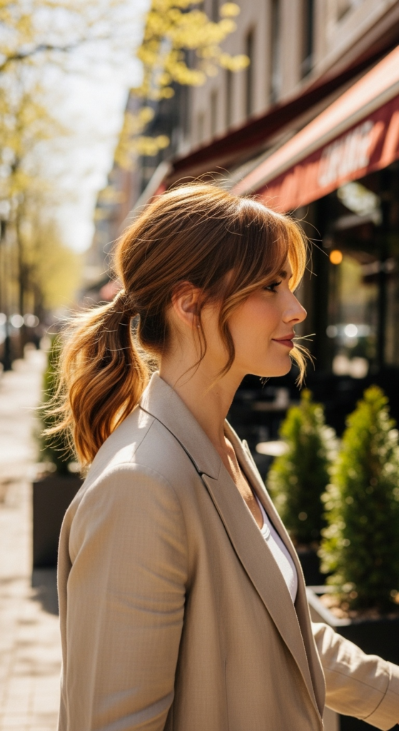 Alt text suggestion: Soft piece-y ponytail with loose face-framing pieces on a sunny spring street — low maintenance spring hairstyles 2026