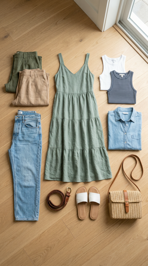 Suggested alt text: Easy summer outfit ideas for moms flat lay featuring olive and tan linen pants, light wash jeans, cotton tanks, chambray shirt, sage midi dress, white sandals, and a straw crossbody bag.