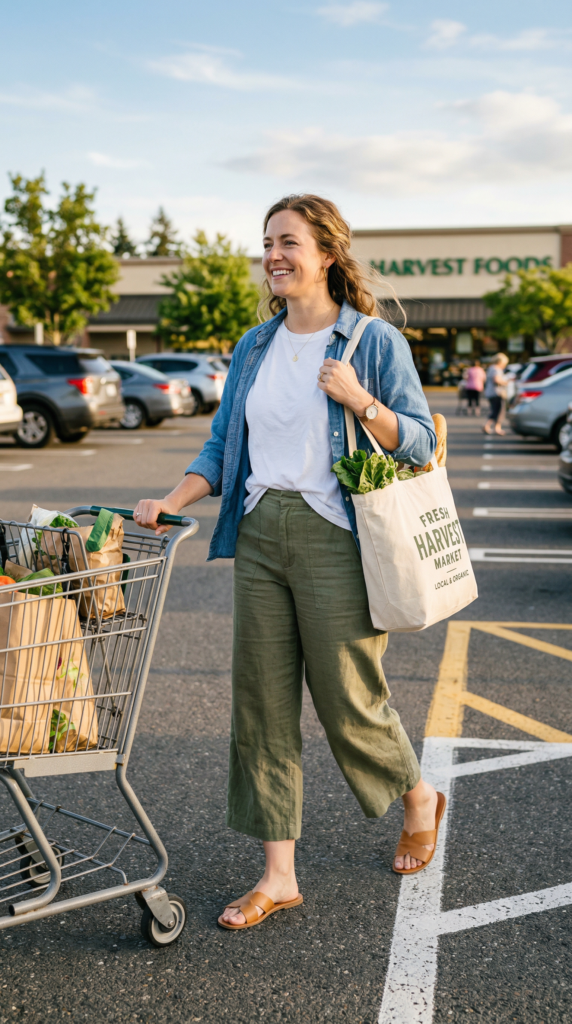 Suggested alt text: Easy summer outfit ideas for moms featuring a white oversized tee, olive wide-leg cropped pants, open chambray shirt, tan flat sandals, and reusable tote in a grocery store parking lot.