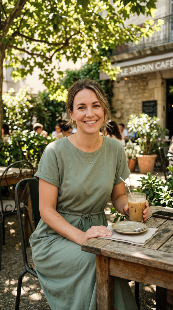 Suggested alt text: Easy summer outfit ideas for moms showing a sage green relaxed-fit cotton midi dress with drawstring waist, gold hoop earrings, and low bun at an outdoor café.