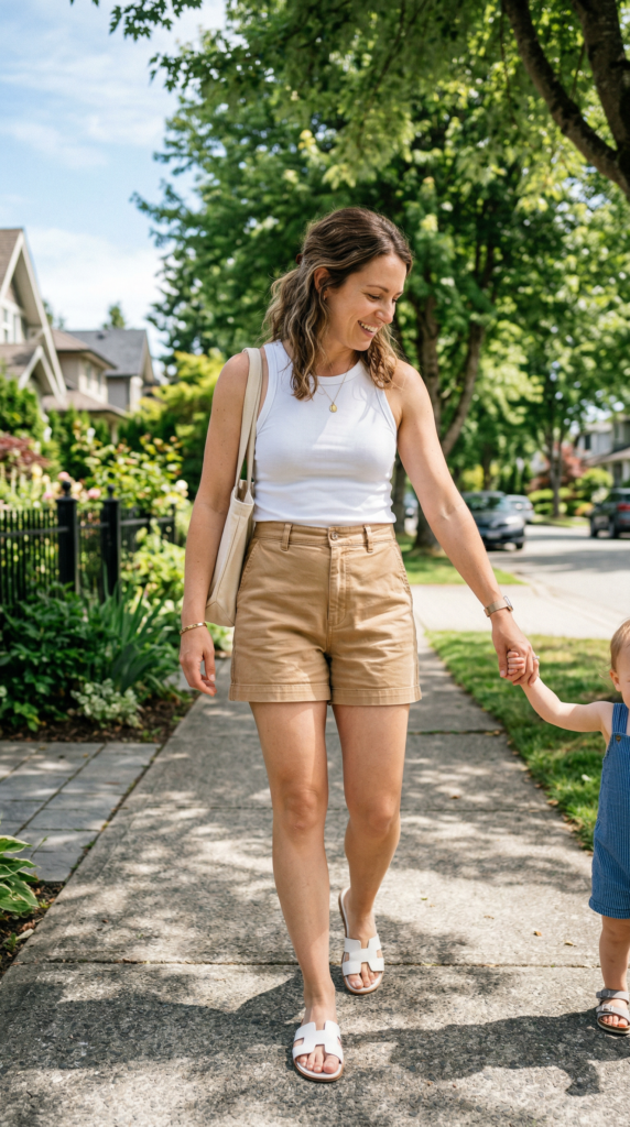 Suggested alt text: Easy summer outfit ideas for moms featuring tan high-waisted cotton twill shorts, white ribbed tank, white leather slides, and delicate gold necklace while holding a toddler’s hand.