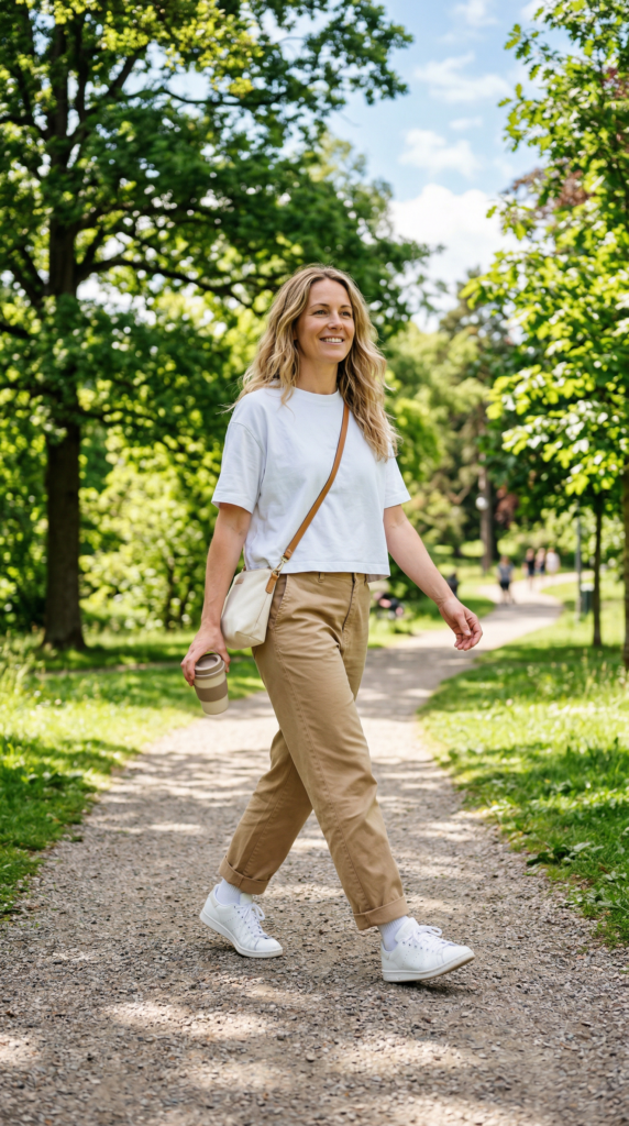 Suggested alt text: Easy summer outfit ideas for moms featuring tan straight-leg cotton trousers, a boxy white tee, white leather sneakers, and a canvas crossbody bag in a sunny park.