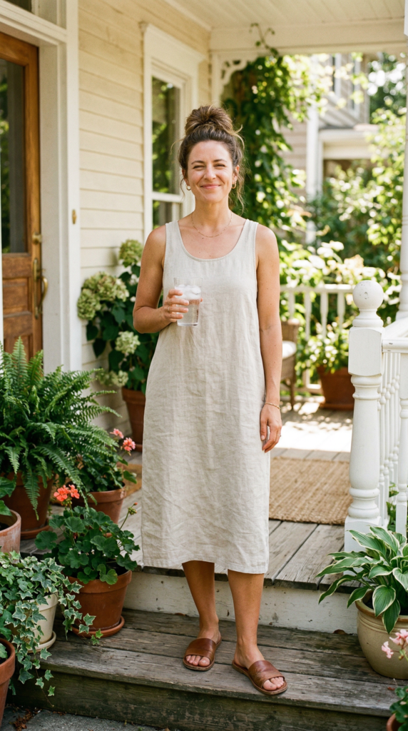 Suggested alt text: Easy summer outfit ideas for moms featuring an oatmeal-colored linen tank dress, brown leather slide sandals, and high messy bun on a bright summer porch.