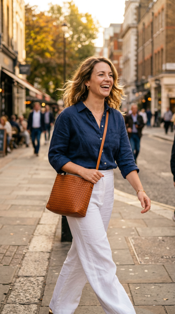 Suggested alt text: Easy summer outfit ideas for moms featuring a navy linen blouse, white wide-leg pants, and a cognac woven leather crossbody tote in warm afternoon light.