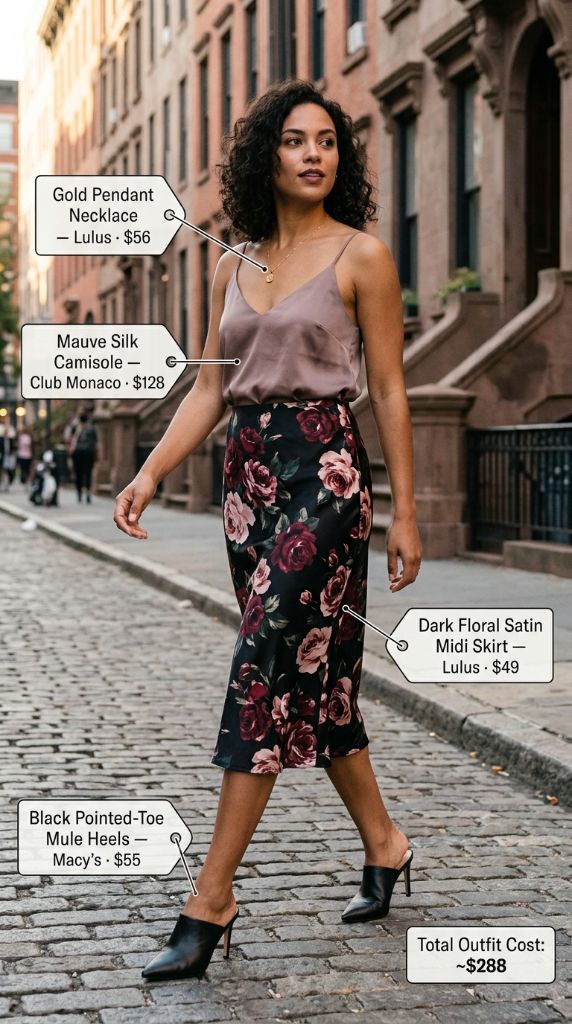 Shop This Look: The Mauve Silk Camisole is from Club Monaco at $128 — shop it here. The Dark Floral Satin Midi Skirt by Lulus for $49 — grab it here. The Gold Pendant Necklace from Lulus at $56 — find it here. And the Black Pointed-Toe Mule Heels from Macy’s at $55 — get them here.
