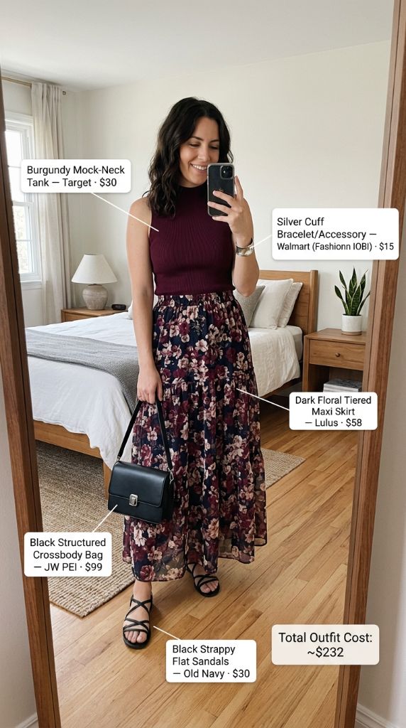 Shop This Look: The Burgundy Mock-Neck Tank is from Target at $30 — shop it here. The Silver Cuff Bracelet from Walmart (Fashionn IOBI) at $15 — find it here. The Dark Floral Tiered Maxi Skirt from Lulus at $58 — grab it here. The Black Structured Crossbody Bag from JW PEI at $99 — snag it here. And the Black Strappy Flat Sandals from Old Navy at $30 — get them here.