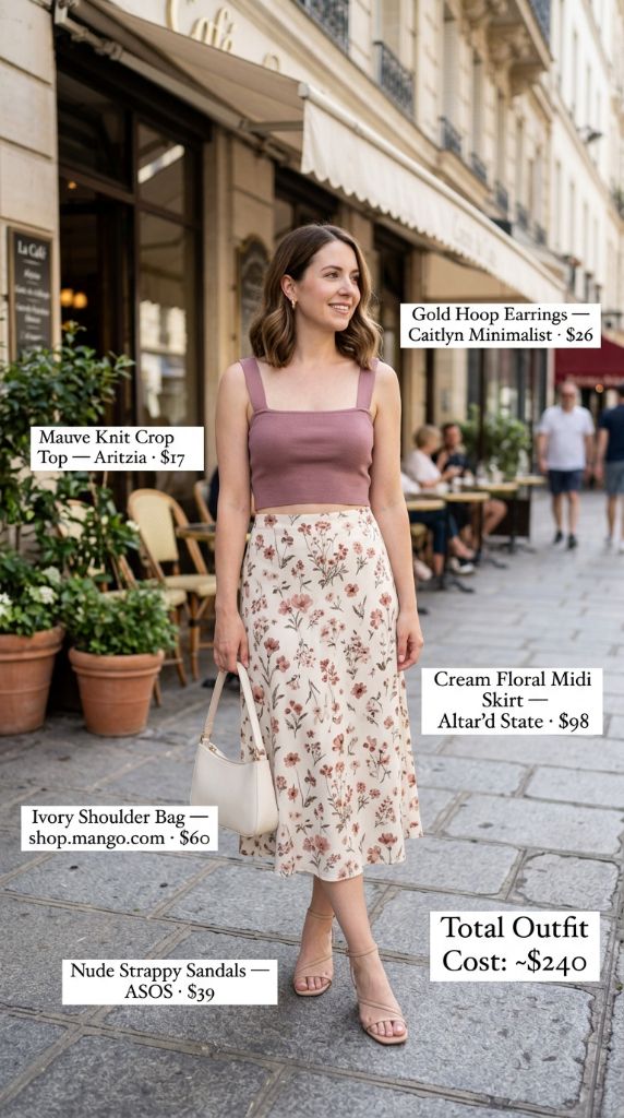 Shop This Look: The Mauve Knit Crop Top is from Aritzia at $17 — shop it here. The Cream Floral Midi Skirt by Altar’d State for $98 — grab it here. The Gold Hoop Earrings from Caitlyn Minimalist for $26 — find them here. The Ivory Shoulder Bag from Mango at $60 — snag it here. And the Nude Strappy Sandals from ASOS at $39 — get them here.