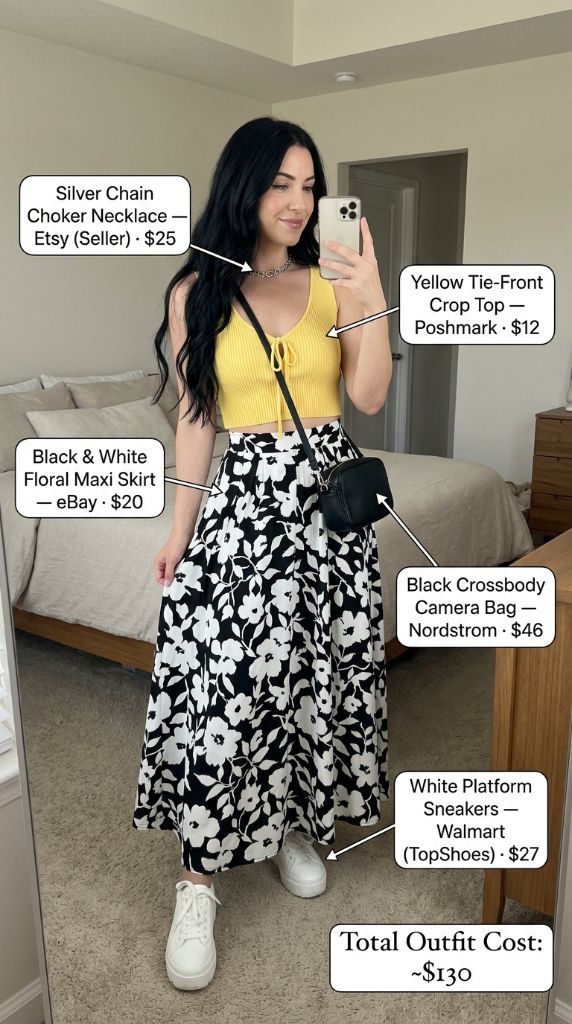 Shop This Look: The Yellow Tie-Front Crop Top is from Poshmark at $12 — find it here. The Black & White Floral Maxi Skirt from eBay for $20 — shop it here. The Silver Chain Choker Necklace from Etsy at $25 — grab it here. The Black Crossbody Camera Bag from Nordstrom at $46 — snag it here. And the White Platform Sneakers from Walmart (TopShoes) at $27 — get them here.