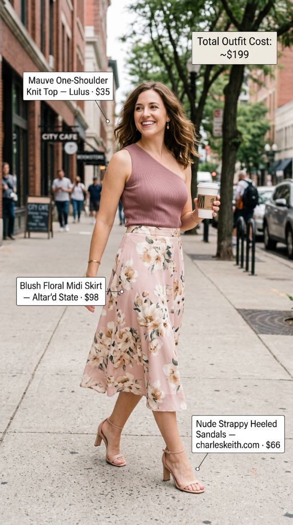 Shop This Look: The Mauve One-Shoulder Knit Top is from Lulus at $35 — shop it here. The Blush Floral Midi Skirt from Altar’d State for $98 — grab it here. And the Nude Strappy Heeled Sandals from Charles & Keith at $66 — find them here.