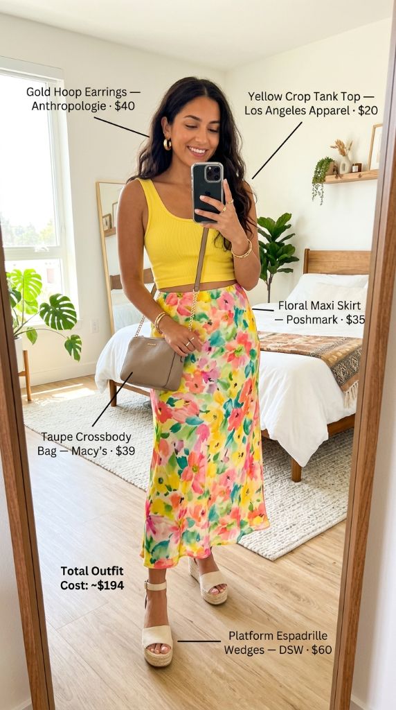 Shop This Look: The Yellow Crop Tank Top is from Los Angeles Apparel at $20 — shop it here. The Floral Maxi Skirt from Poshmark for $35 — find it here. The Gold Hoop Earrings from Anthropologie at $40 — grab them here. The Taupe Crossbody Bag from Macy’s at $39 — snag it here. And the Platform Espadrille Wedges from DSW at $60 — get them here.