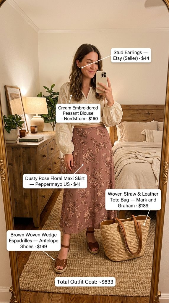Shop This Look: The Cream Embroidered Peasant Blouse is from Nordstrom at $160 — shop it here. The Dusty Rose Floral Maxi Skirt from Peppermayo US for $41 — grab it here. The Stud Earrings from Etsy at $44 — find them here. The Woven Straw & Leather Tote Bag from Mark and Graham at $189 — snag it here. And the Brown Woven Wedge Espadrilles from Antelope Shoes at $199 — get them here.