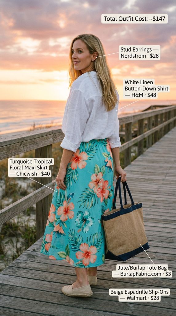Shop This Look: The White Linen Button-Down Shirt is from H&M at $48 — shop it here. The Turquoise Tropical Floral Maxi Skirt from Chicwish for $40 — grab it here. The Stud Earrings from Nordstrom at $28 — find them here. The Jute/Burlap Tote Bag from BurlapFabric.com at $3 — snag it here. And the Beige Espadrille Slip-Ons from Walmart at $28 — get them here.