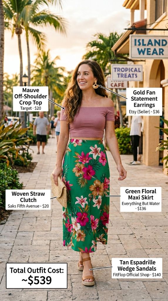 Shop This Look: The Mauve Off-Shoulder Crop Top is from Target at $20 — shop it here. The Green Floral Maxi Skirt from Everything But Water for $136 — grab it here. The Gold Fan Statement Earrings from Etsy at $36 — find them here. The Woven Straw Clutch from Saks Fifth Avenue at $20 — snag it here. And the Tan Espadrille Wedge Sandals from FitFlop at $140 — get them here.