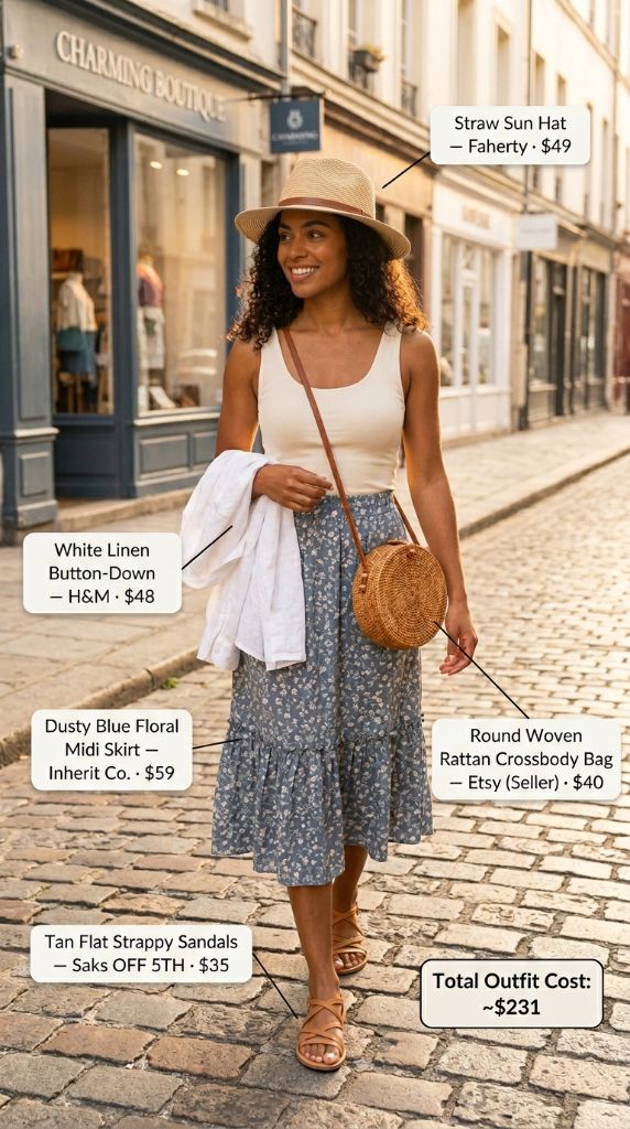 Shop This Look: The Straw Sun Hat is from Faherty at $49 — shop it here. The White Linen Button-Down from H&M at $48 — grab it here. The Dusty Blue Floral Midi Skirt from Inherit Co. for $59 — find it here. The Round Woven Rattan Crossbody Bag from Etsy at $40 — snag it here. And the Tan Flat Strappy Sandals from Saks OFF 5TH at $35 — get them here.
