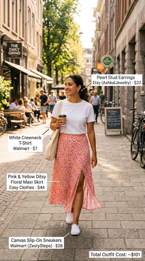 Shop This Look: The White Crewneck T-Shirt is from Walmart at $7 — shop it here. The Pink & Yellow Ditsy Floral Maxi Skirt from Easy Clothes for $44 — grab it here. The Pearl Stud Earrings from Etsy (AshkalJewelry) at $22 — find them here. And the Canvas Slip-On Sneakers from Walmart (ZestySteps) at $28 — get them here.