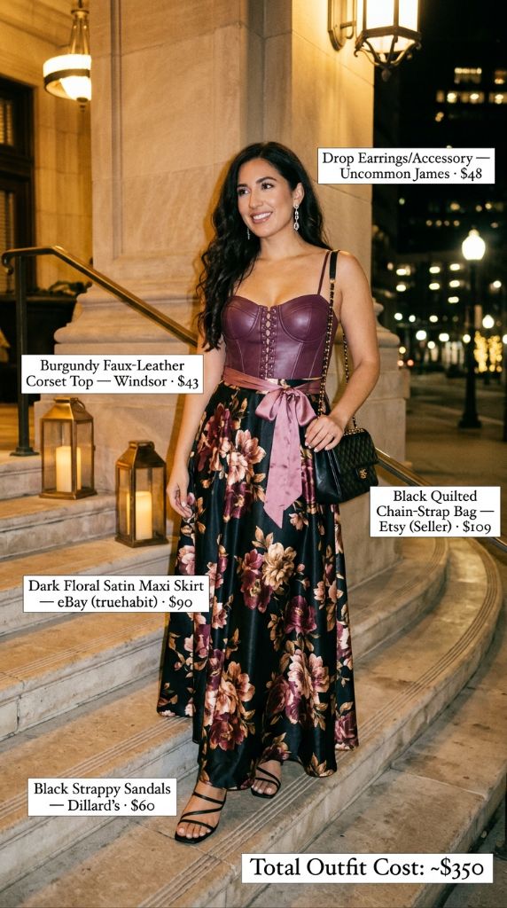 Shop This Look: The Burgundy Faux-Leather Corset Top is from Windsor at $43 — shop it here. The Dark Floral Satin Maxi Skirt from eBay (truehabit) for $90 — find it here. The Drop Earrings from Uncommon James at $48 — grab them here. The Black Quilted Chain-Strap Bag from Etsy at $109 — snag it here. And the Black Strappy Sandals from Dillard’s at $60 — get them here.