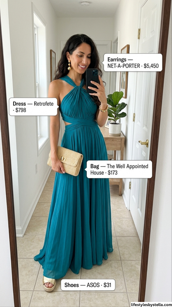 The accessories here are doing exactly what they should — complementing, not competing. Gold tones against teal is one of my favorite pairings, and the woven clutch adds just enough texture to keep things interesting. Those flat gold sandals are a smart move too — because if the dress is this dramatic, you don’t need a stiletto to make the statement. The dress is the statement.