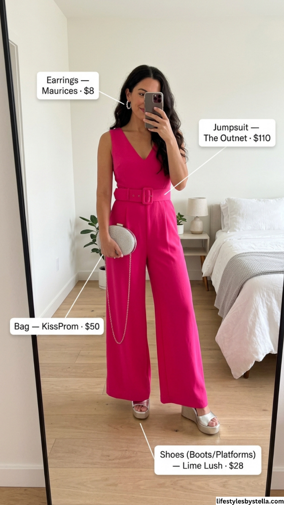 For anyone searching for stylish summer night out outfits that don’t require mixing and matching five separate pieces, a jumpsuit is your best friend. You throw it on, add earrings, and you’re done. The streamlined shape also means you can go bigger on accessories without looking cluttered. Silver and hot pink is a pairing I come back to every summer — there’s a coolness to the metallic that balances the warmth of fuchsia. If you’re heading to a birthday dinner, a bachelorette, or even a sparkly concert night, this look translates beautifully.