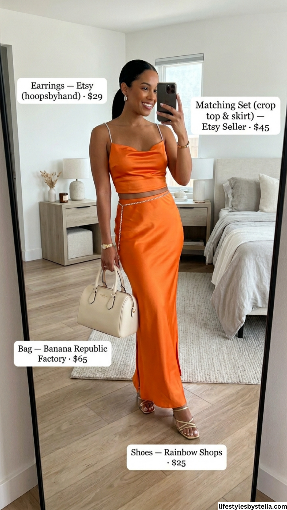 This matching set stops me every time I look at it. Orange satin in the summer? It practically glows. The cowl-neck crop top with rhinestone spaghetti straps feels luxurious without being over-the-top, and that maxi skirt with the subtle slit gives you movement and a peek of leg that’s effortlessly chic. There’s a warmth to this color that just works with sun-kissed skin — it’s the shade of a Aperol spritz at golden hour, and honestly, that’s the whole vibe.