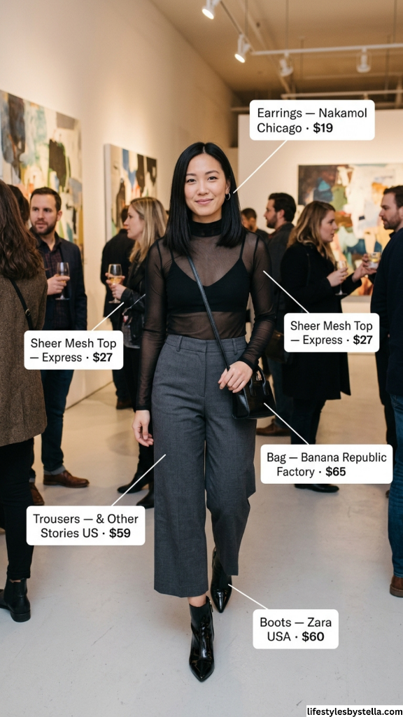 Shop This Look: The Sheer Mesh Top is from Express at $27 — shop it here. The Earrings from Nakamol Chicago are $19 — find them here. The Trousers from & Other Stories US are $59 — grab them here. The Bag from Banana Republic Factory is $65 — snag it here. And the Boots from Zara USA at $60 — check them out here.