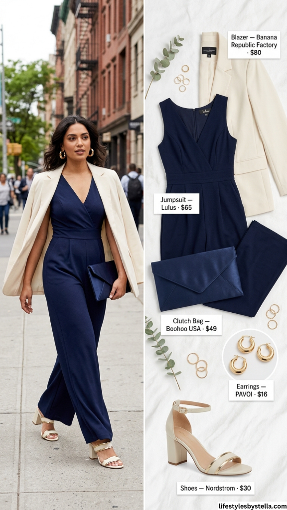 5. Navy Jumpsuit with Cream Blazer: Sophisticated Summer Night Out Outfit