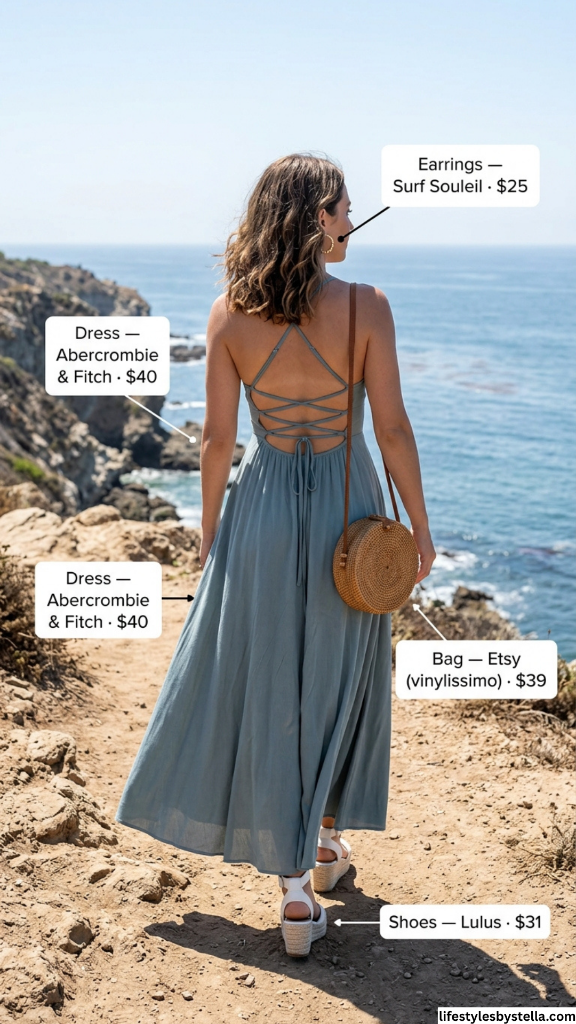 The round rattan crossbody bag adds that perfect bohemian texture, and the espadrille wedge sandals are the ideal footwear choice — they give height without sinking into sand. Gold hoop earrings keep the jewelry minimal and sun-friendly. Everything about this look says “I’m on vacation, even if I’m not.”