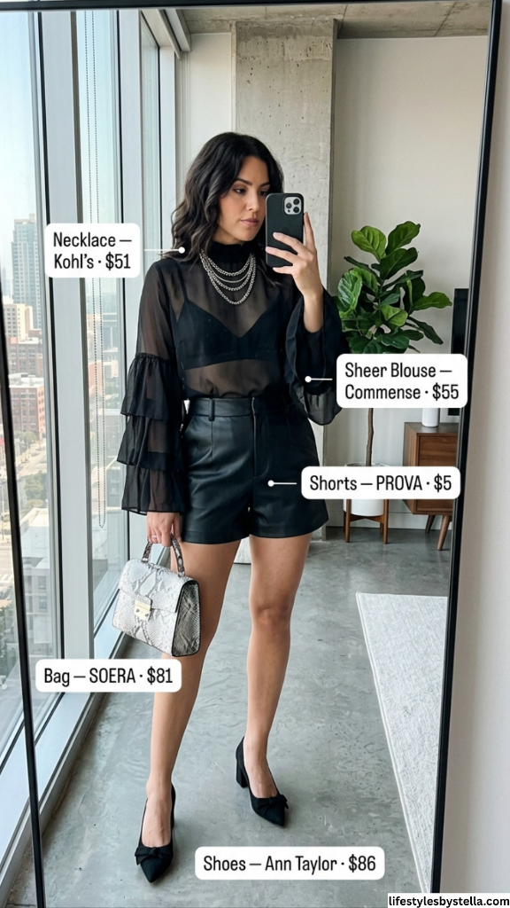 7. All-Black Sheer Blouse and Leather Shorts: Edgy Summer Night Out Outfit