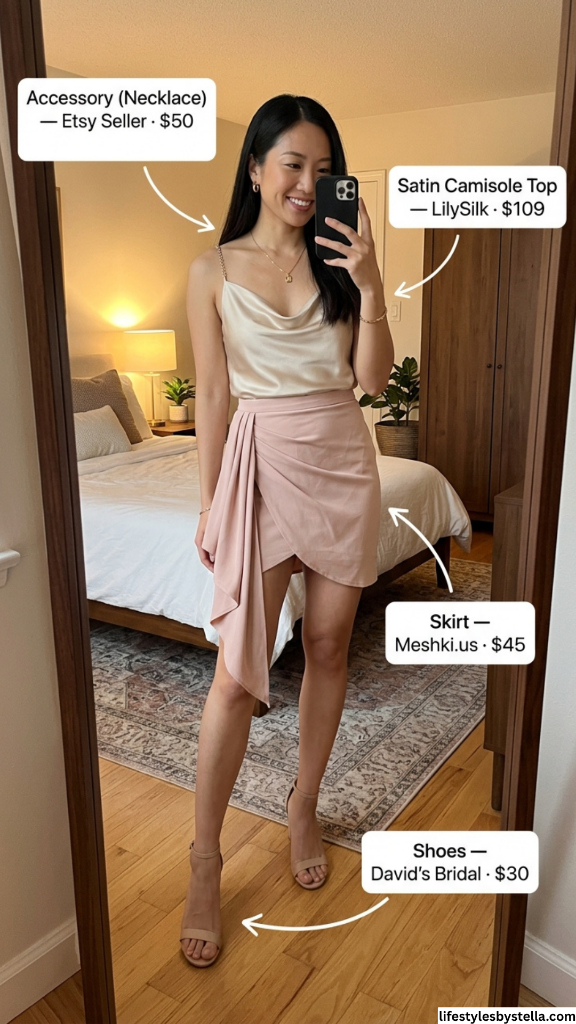 Shop This Look: The Satin Camisole Top is from LilySilk at $109 — shop it here. The Skirt from Meshki.us is $45 — find it here. The Accessory (Necklace) from an Etsy Seller is $50 — browse it here. And the Shoes from David’s Bridal at $30 — grab them here.
