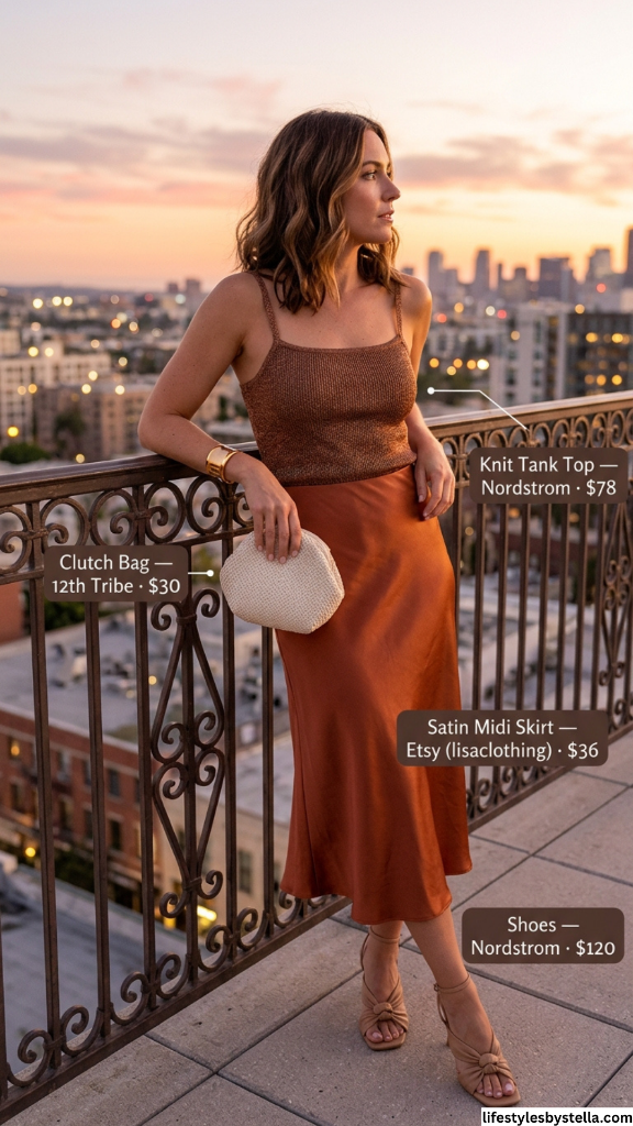 I’ve been obsessed with warm rust and copper tones for summer 2026, and this outfit is exactly why. The knit tank top from Nordstrom in that rich brown has a texture that photographs beautifully and feels elevated beyond your average tank — it’s the kind of top that makes people look twice. Paired with a burnt orange satin midi skirt from Etsy, you get this gorgeous tonal story that looks like a sunset got translated into clothing. The satin catches every bit of light, which at golden hour makes this outfit genuinely glow.