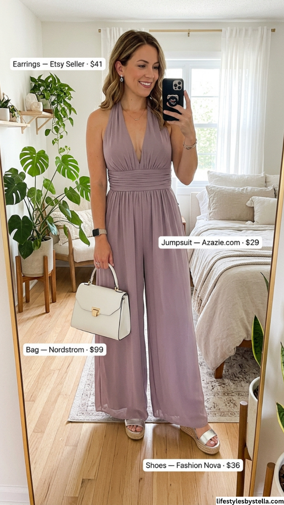 If this jumpsuit doesn’t make you feel something, I don’t know what will. The color — a soft mauve-lilac that shifts between dusty rose and lavender depending on the light — is genuinely one of the most flattering shades I’ve seen this season. This Azazie jumpsuit has a halter neckline with a plunging V that creates a beautiful frame for the face and collarbone, and the chiffon fabric floats in a way that feels romantic and free. The wide-leg silhouette gives it that elegant, almost goddess-like quality.